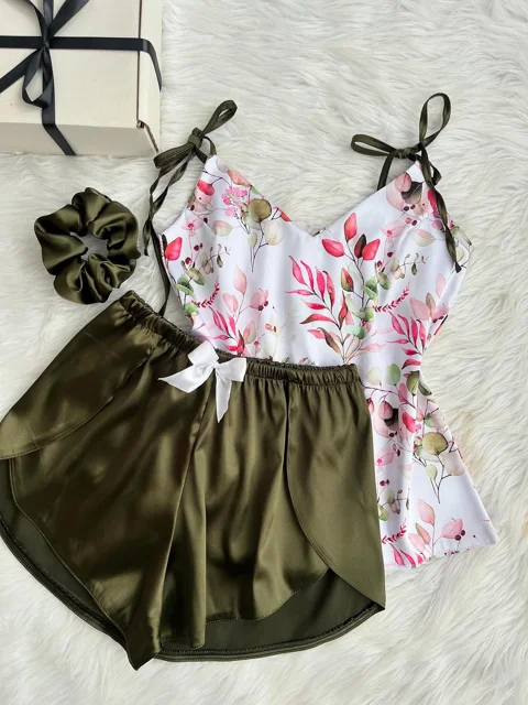 ست تاپ و شورتک ساتن گل زیتونی شامل تاپ و شورتک از جنس ساتن با طرح گلهای زیتونی است. این ست زیبا و راحت مناسب استفاده روزمره و مهمانیها بوده و جلوهای شیک و متفاوت به استایل شما میبخشد. کیفیت بالا و دوخت دقیق از ویژگیهای این محصول است.
